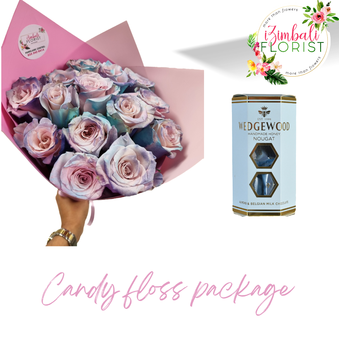 Sweet Candy Package consists of a bunch of 15 x Candy floss roses and a box of Wedgewood Nougat